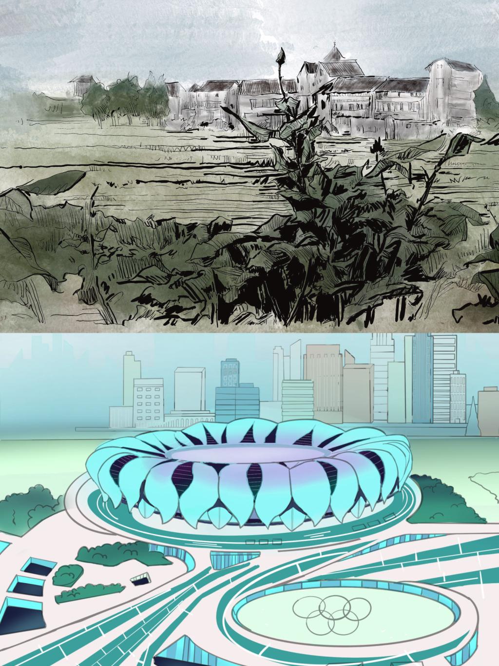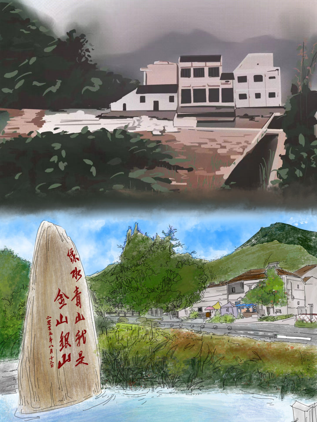 师生党员们从杭州市城市规划展览馆出发,走过安吉余村,穿过诸暨枫桥……大家循着习近平总书记的足迹,见证了雄伟秀丽“大莲花”的嬗变、“两山理念”发源地安吉余村的蜕变、“枫桥经验”社会治理的蝶变。“2003年以前的安吉余村还是一个灰尘蔽日、污水横流的生态恶劣村;2006年的杭州奥体大莲花所在地还是一片菜田……”,大家穿越时空领略了浙江大地日新月异的发展变化后,发挥艺术类员工党员的特长,用画笔创作了一幅幅今昔对比图,生动展现了“八八战略”实施20周年以来,浙江各地各领域发生的深刻变化和取得的历史性成就。