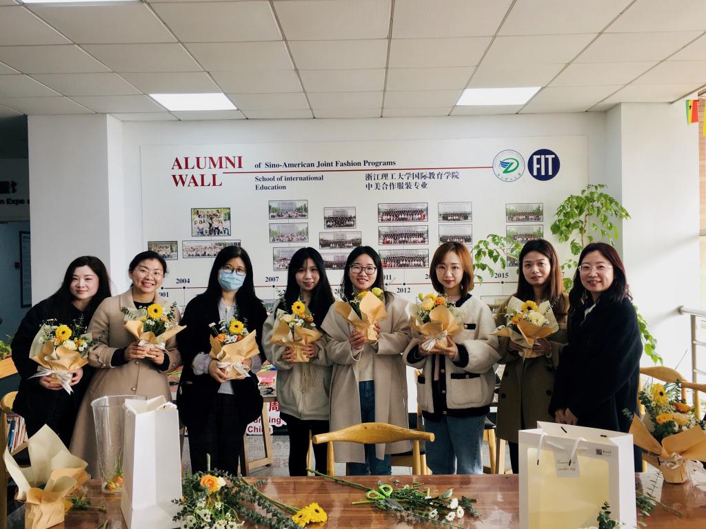 活动伊始,毕业于16届中美服装设计与工程系的王碧翰同学作为一名自主创业的鲜花店主,为老师们讲解了中式、西式插花的技巧原则和花卉养护,并现场演示了插花的造型塑造。在王同学的指导下,老师们开始修葺枝叶、搭配色彩,互相探讨交流着心得,以充沛的热情投入到插花创作之中。康乃馨、洋桔梗、非洲菊....有着明媚花语的各式鲜花们在老师们手里组合成了一盆盆创意十足、落落大方的插花作品,与人面“相映红”。