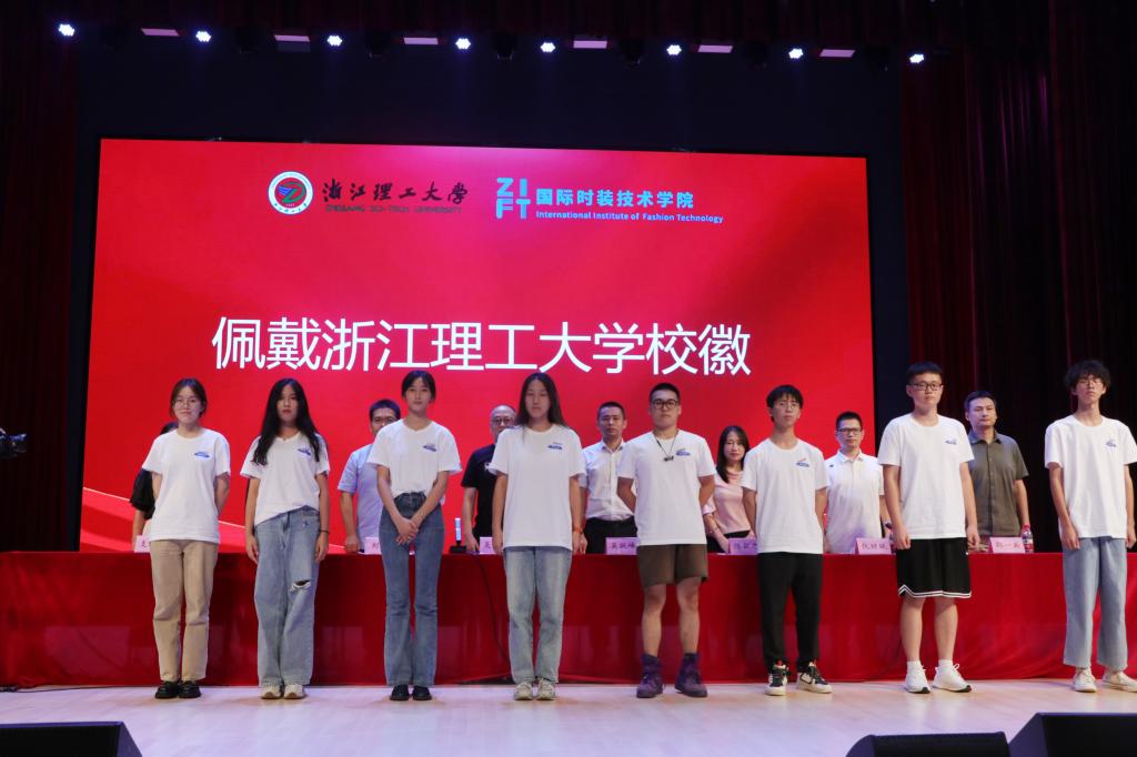 主席台领导为新生代表佩戴校徽,授予“浙理人”的光荣身份。