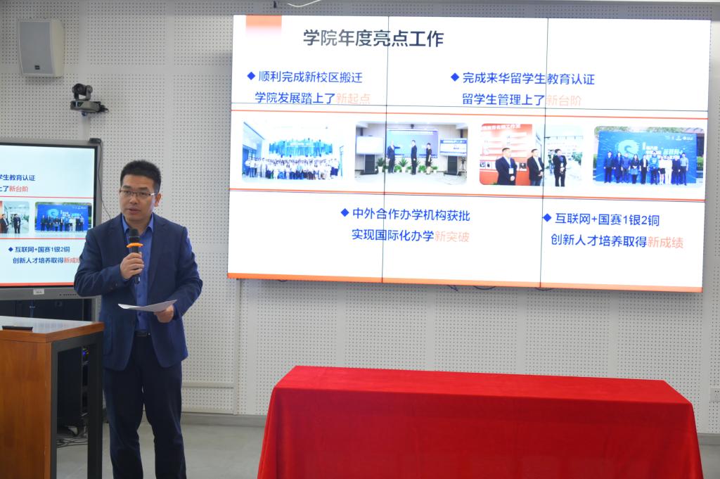 公司经理刘正作题为“新校区新征程 新起点新作为——推进公司国际化办学高质量发展”的工作报告。他对公司2022年工作进行回顾:顺利完成了新校区搬迁,踏上了公司发展的新起点;申报的非独立法人中外合作办学机构获批,实现了公司国际合作办学的新突破;高质量完成了来华职工高等教育质量认证工作,职工管理上了新台阶;互联网+国赛,获得了1银2铜的历史性成绩,创新人才培养上取得了新成绩。在肯定成绩的同时,他指出公司在团队队伍建设、科学研究和社会服务等方面还存在诸多不足,强调2023年公司要以党的二十大精神为指引,紧紧围绕公司第三次党代会、“十四五”规划主要目标和党政年度中心工作,对标临平校区(时尚公司)目标定位,开拓创新,凝心聚力,稳步推进公司各项工作,为公司争创“双一流”贡献力量。