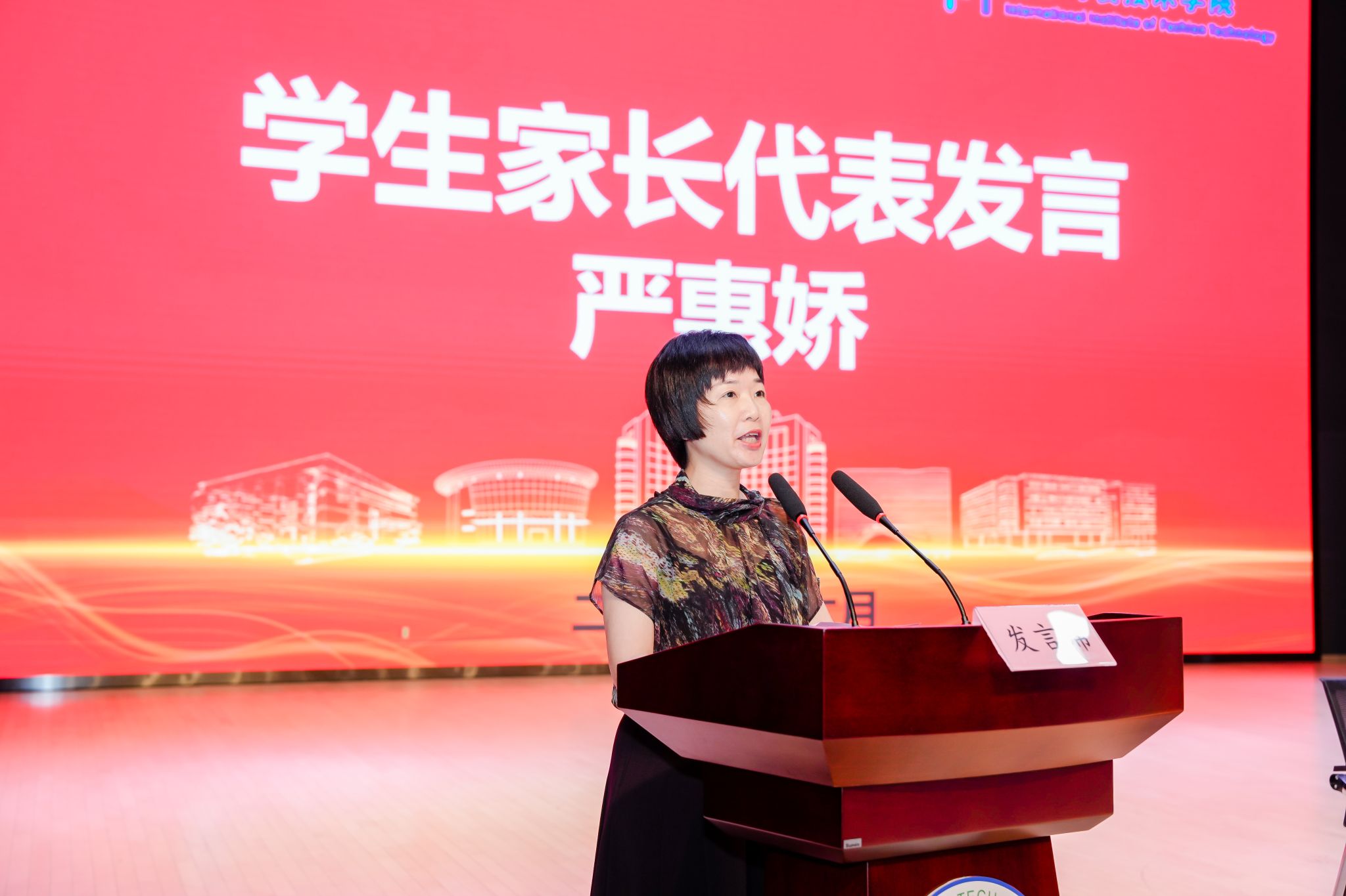 毕业生家长代表严惠娇表示她欣慰地看到孩子们在专业学习中的成长蜕变,从青涩到自信成熟。作为家长,她寄语毕业生要胸怀大志、永葆热爱、涵养品格、珍爱自我,既要勇敢追梦,也要记得家永远是温暖的港湾。