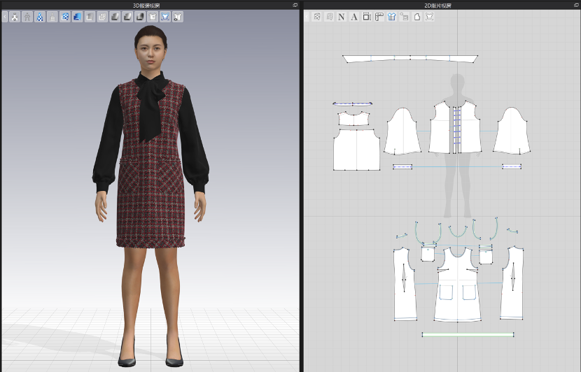 3D服装设计,是利用计算机仿真技术生成虚拟服装模型,从而进行的计算机辅助设计。基于数字化面料和人台,设计师通过3D设计可以进行实时开发,直观表达设计意图,并在3D设计环节即可对齐色样进行评审;版师能更直观的看到廓形,方便快速查找和使用基础廓形,减少衍生版型的产生;用虚拟样衣替换头版样,减少服装公司对样衣工的需求,降低成本。