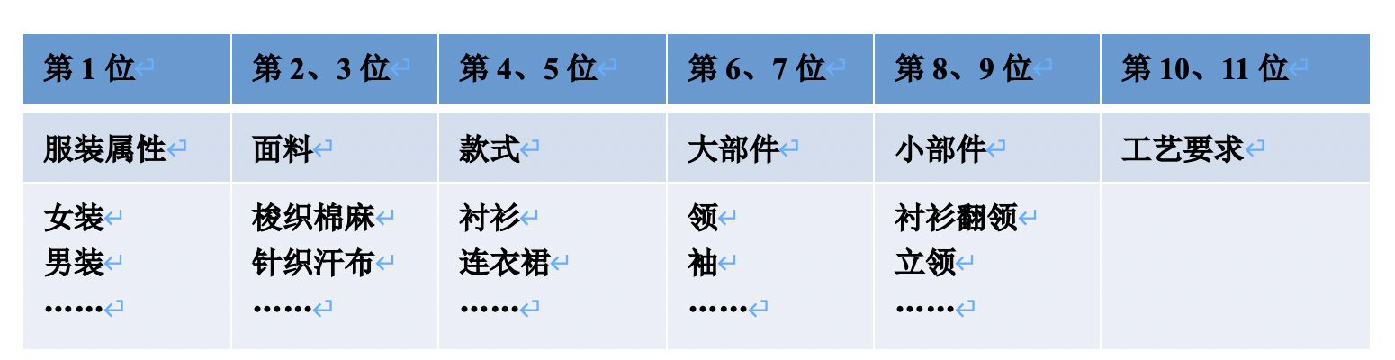1.1制定一套工艺编码规则,使每个编码能够清晰表达对应的款式信息和工艺标准。